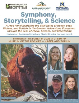 The Bozeman Symphony and Montana State University’s Montana Institute on Ecosystems invite the public to Symphony, Storytelling, & Science. This dynamic panel discussion blends music, science, and storytelling to highlight the vital roles of honey bees, wolves, and buffalo in the Greater Yellowstone Ecosystem.